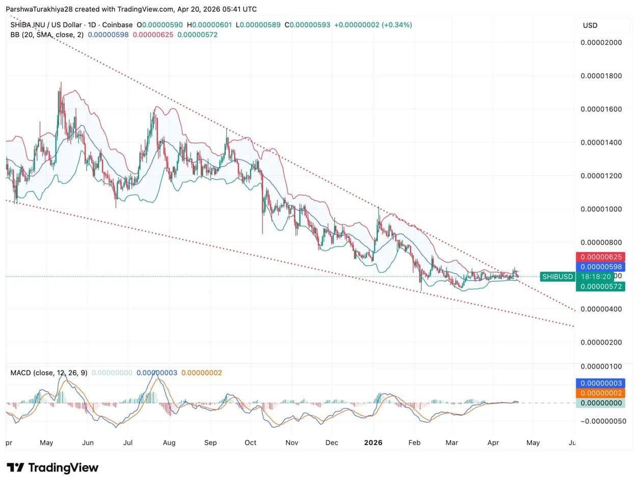 SHIB 日线图:价格测试布林带中轨时,MACD 转为正值