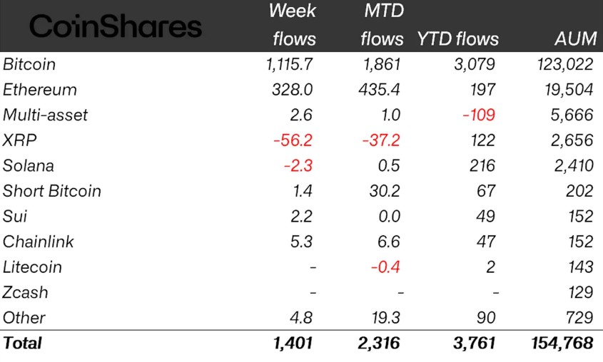 上周,加密货币投资产品流入资金达14亿美元,比特币价格几乎触及7.8万美元,资产管理规模升至1548亿美元。