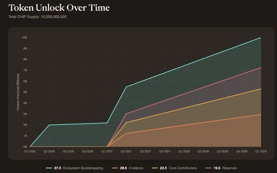 CHIP 的总供应量固定为 100 亿枚代币,使其成为协议层面的非通胀资产。其分配方案旨在平衡投资者参与、团队激励和生态系统发展,而解锁计划则控制着代币供应量随时间推移进入流通的速度。与许多早期加密项目一样,相当一部分代币被预留用于激励和长期发展,这意味着随着协议的成熟,未来的解锁可能会影响市场动态。