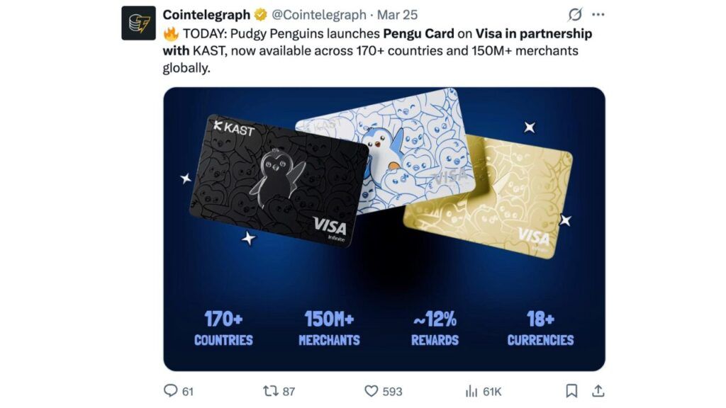 近期生态系统发展包括与资产管理公司 VanEck 合作推出支持 NFC 芯片的混合收藏品,以及推出由 Visa 支持的加密货币借记卡 Pengu Card,这两项举措均于 2026 年 4 月宣布。这些并非空泛的路线图承诺,而是已经上线或即将上线的产品,为 PENGU 持有者提供了切实的实用价值,而 NFT 收藏家(他们大多持有流动性较差的资产)则无法直接受益。