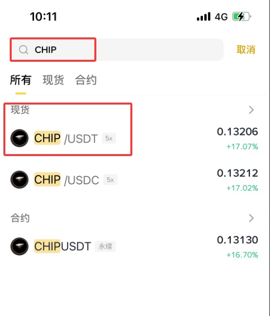 3、输入【CHIP】,这时下拉会显示【现货】【CHIP/ USDT】,点击【CHIP/ USDT】。(作为新手,不建议做合约,所以这里就不演示合约购买方式了。)