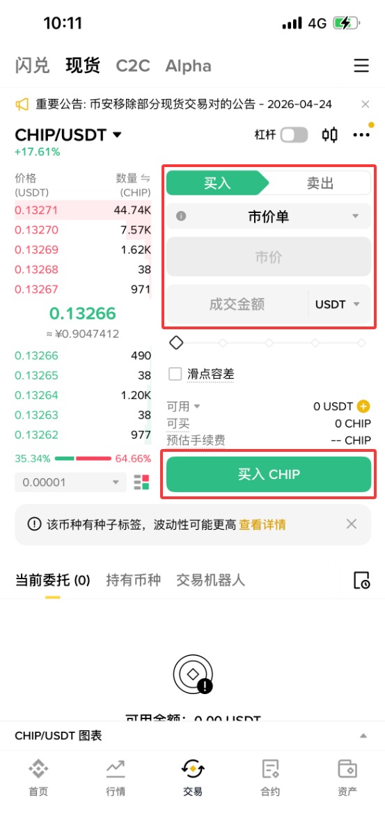 下面以币安为例,为大家演示CHIP币购买步骤教程。