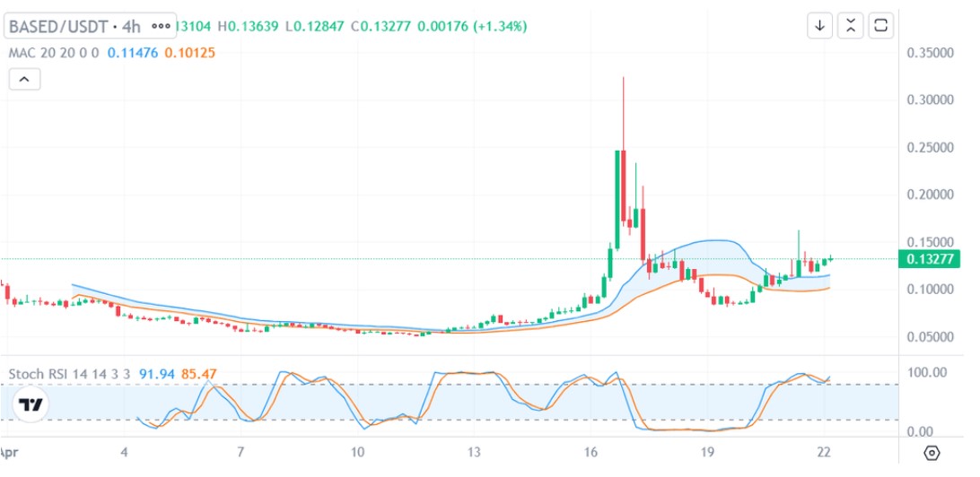 BASED 的交易价格约为$0.13277,在4 小时图表上上涨1.34%,24 小时内的最高点为$0.13639,最低点为$0.12847。