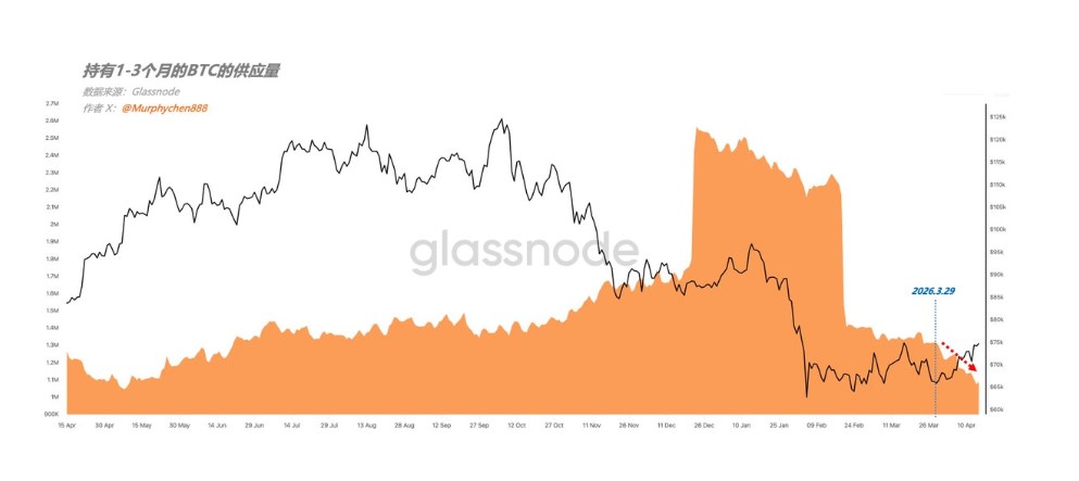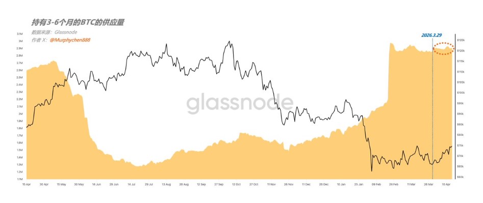 再看图3,持有3-6个月的BTC供应量中,在3月29日之后并没有明显增多。那就证明是情况2,即1-3个月的BTC在反弹中被卖了,目前还有109万枚。