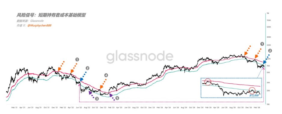 STH-RP模型作为比特币价格的风险信号,压制价格突破并可能引发下行趋势,当前BTC处于势能衰减的第2阶段,在绿线(约$72,000)遇阻,趋势向下,技术指标显示3月份与1月份形态相似,受下行趋势线压制,假突破后继续下探,下文将为大家详细介绍