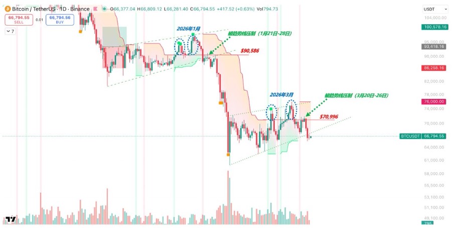 比如在1月21日-28日期间,BTC就是持续无法突破$90,586(红色趋势线),最终选择了继续下探。而这一次在3月20日-26日期间又是无法有效站上$70,996后向下至$65,548。