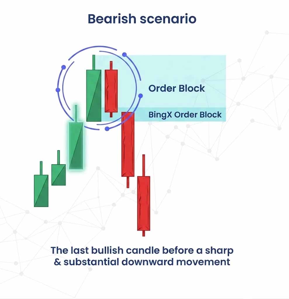 看跌订单区块是强劲向下冲动移动之前紧接着的最后一根看涨蜡烛(或最后一组看涨蜡烛)。它代表机构卖家在急剧推低价格之前悄悄分配的区域。