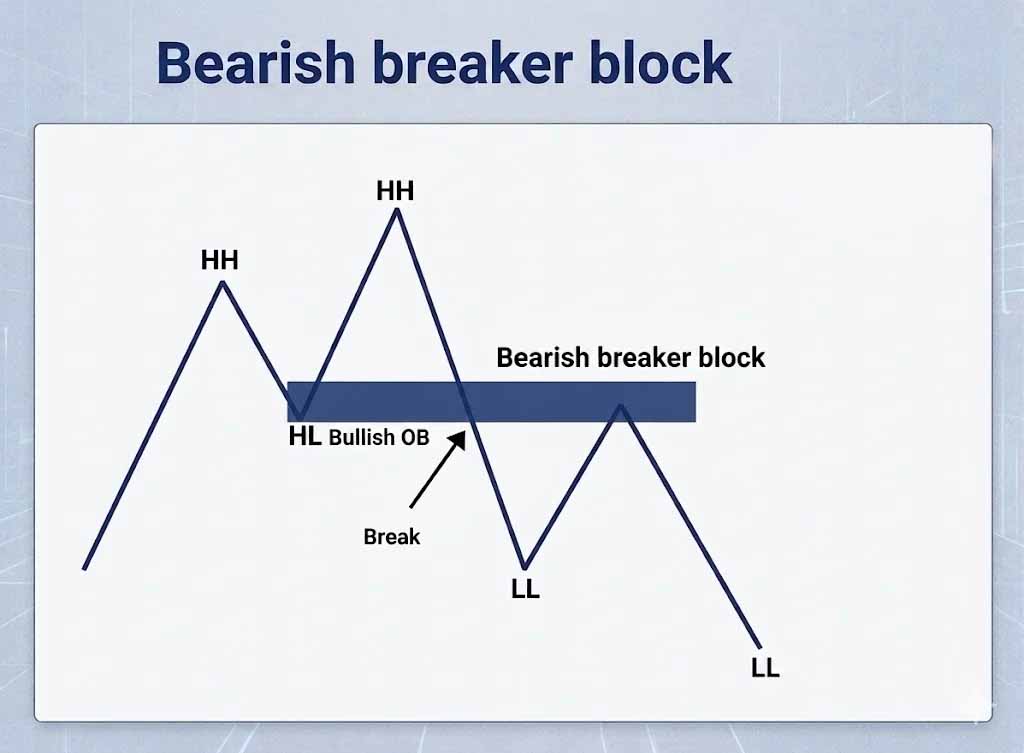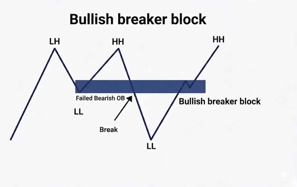 突破区块是当价格突破订单区块并收盘超越该区域后,订单区块变成的区块。当订单区块被违反,即价格穿过它而不尊重它时,该区域"翻转"其功能: