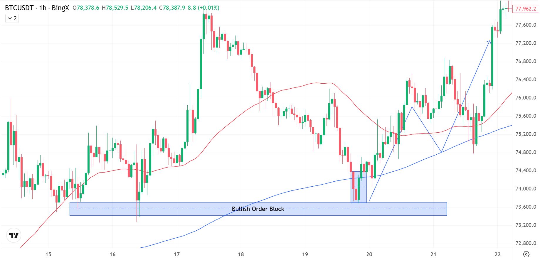 例如,在上面的图表中,比特币在1小时图表上在$73,500–$74,200区域形成了教科书式的看涨订单区块,标记了急剧机构买入冲动前的最后一根看跌蜡烛。价格在上升趋势线支撑附近触及这个需求区域,RSI达到超卖区域,触发了向$76,500+的快速复苏。这种反应确认了该区域的智能资金累积,使其成为高汇合看涨OB设置。