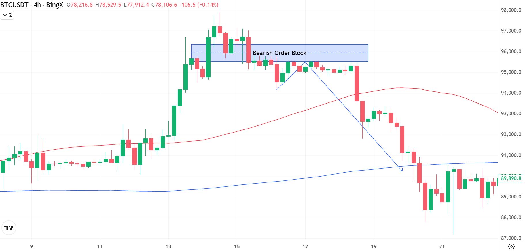 BTC/USDT 4小时看跌OB形成 - 来源:BingX