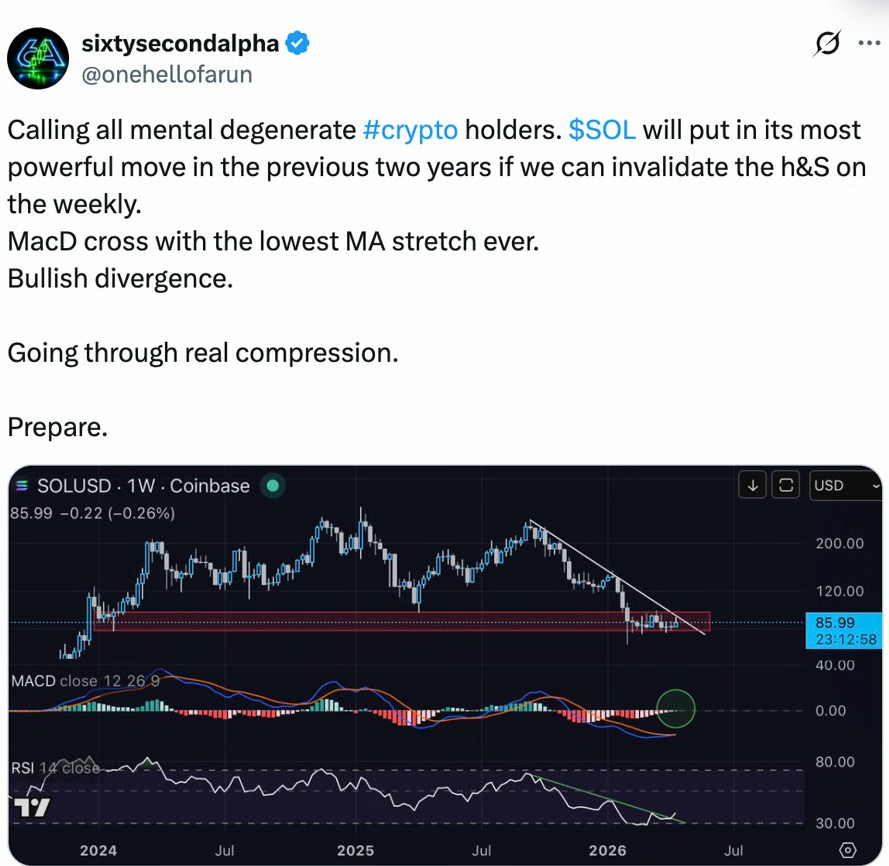另一位分析师Sixtysecondalpha表示,MACD指标在创下“有史以来最低水平”后出现交叉,且RSI呈现看涨背离,这意味着SOL价格已准备好迎来两年来“最强势的走势”。