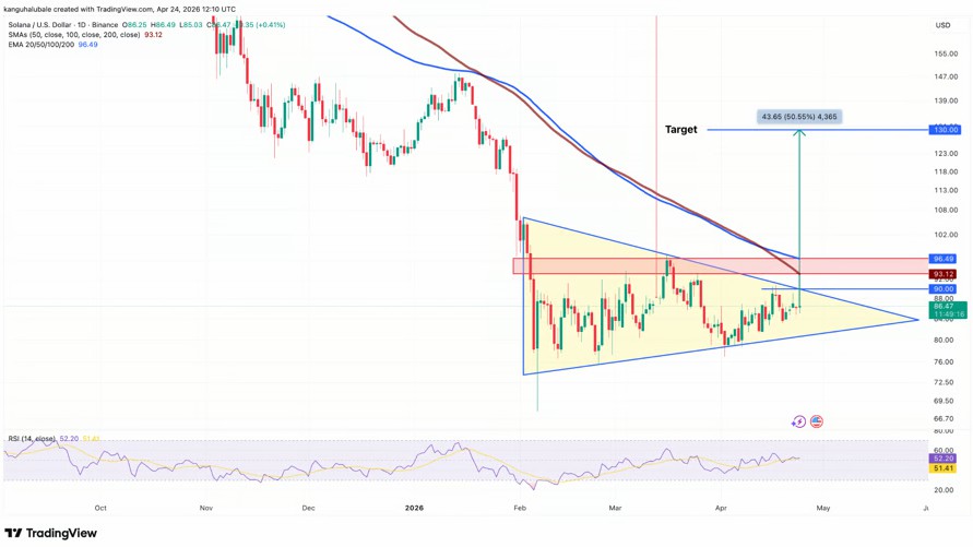 - 索拉纳价格图表上的对称三角形目标价为130美元。