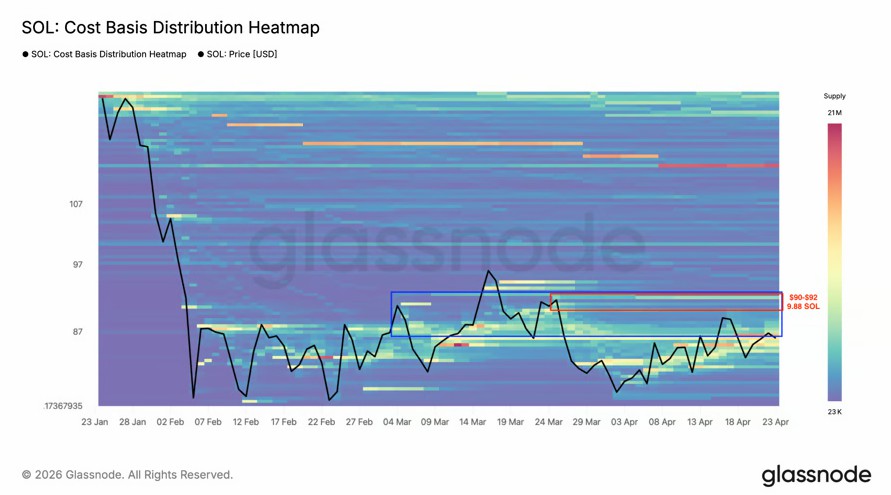 根据Solana的成本基础分布数据,现货价格上方存在大量供应过剩,投资者持有的SOL数量约为990万枚,平均成本在90至92美元之间,这构成了一个可能的阻力区域。
