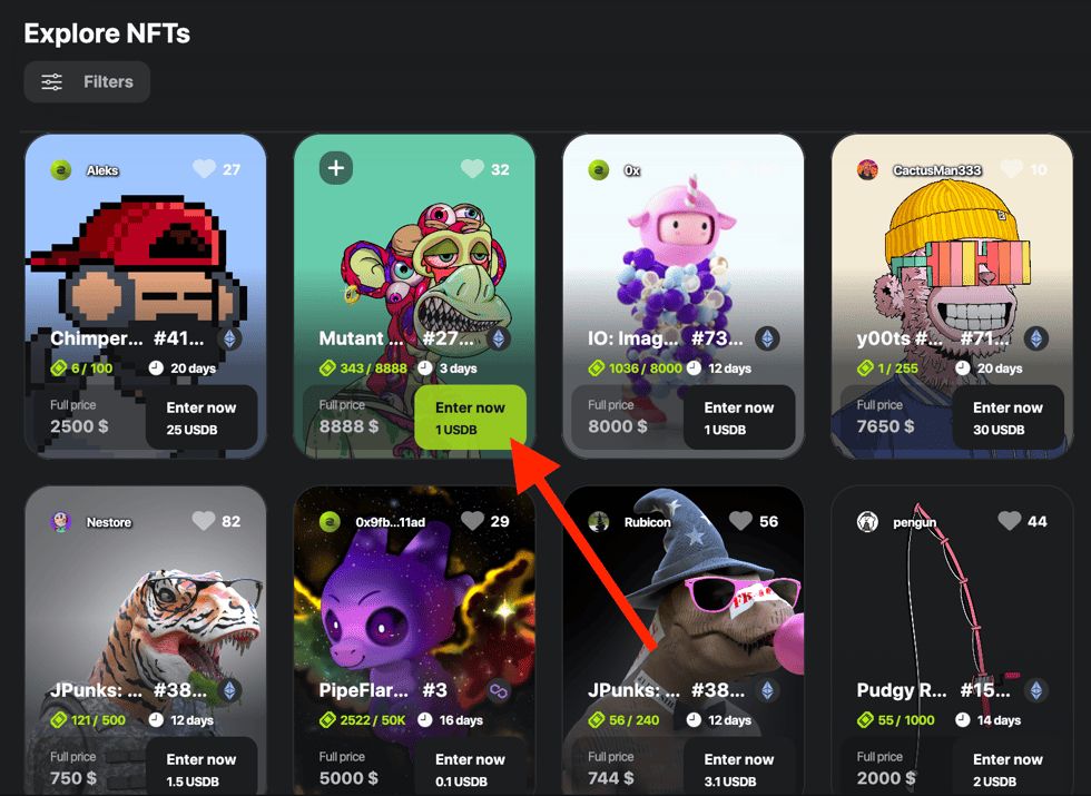 - 票券销售机制: 卖家列出一项资产,例如无聊猿 NFT 或代币包,价格为 50,000 美元。他们可能发行 1,000 张票券,每张 50 美元。一旦所有票券售出,就选出获奖者。