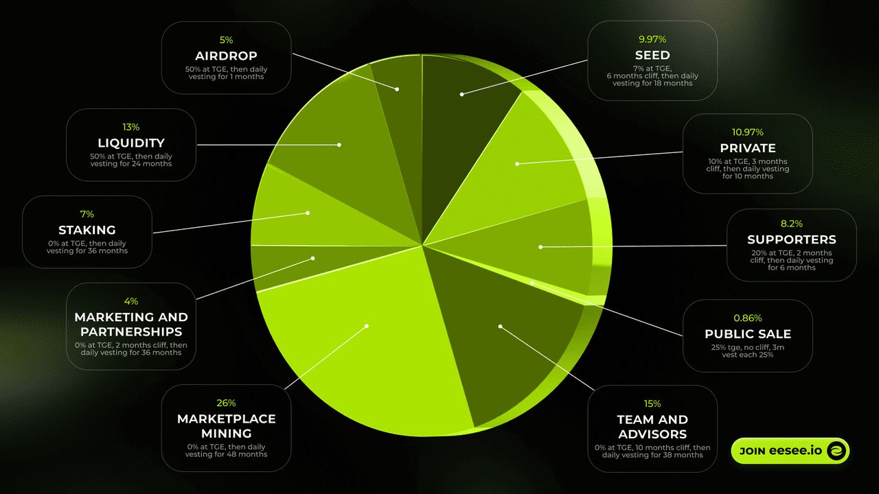 - 公司资金库 (18%): 由基金会管理,用于资助营运费用、战略合作伙伴关系和 eesee 协议的未来发展。