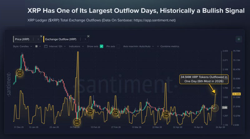 据Santiment数据显示,截至周六,XRP账本(XRPL)在过去24小时内记录了近3500万枚XRP的交易所流出,创下今年第六大单日流出量。