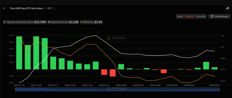 XRP ETF每周净资金流。来源:SoSoValue