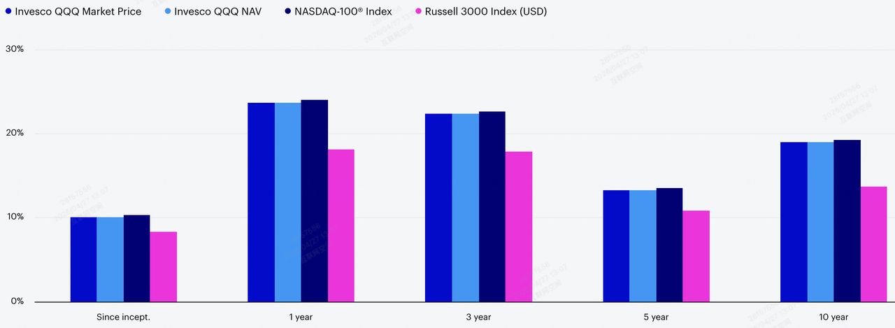 QQQ与纳斯达克100和罗素3000的年化回报率 | 来源:Invesco