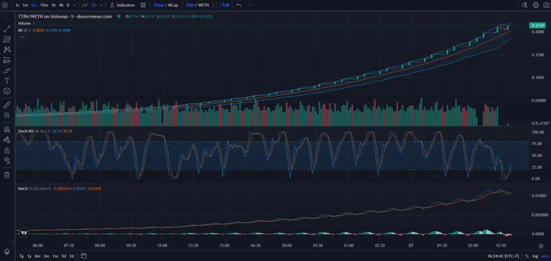 TTPA 价格分析目前显示出强劲的上涨动能,但也出现了可能的短期疲乏迹象。在5 分钟图表上,TTPA 一直在清晰的上涨结构中运行,价格在大部分反弹期间保持在中间布林带之上。