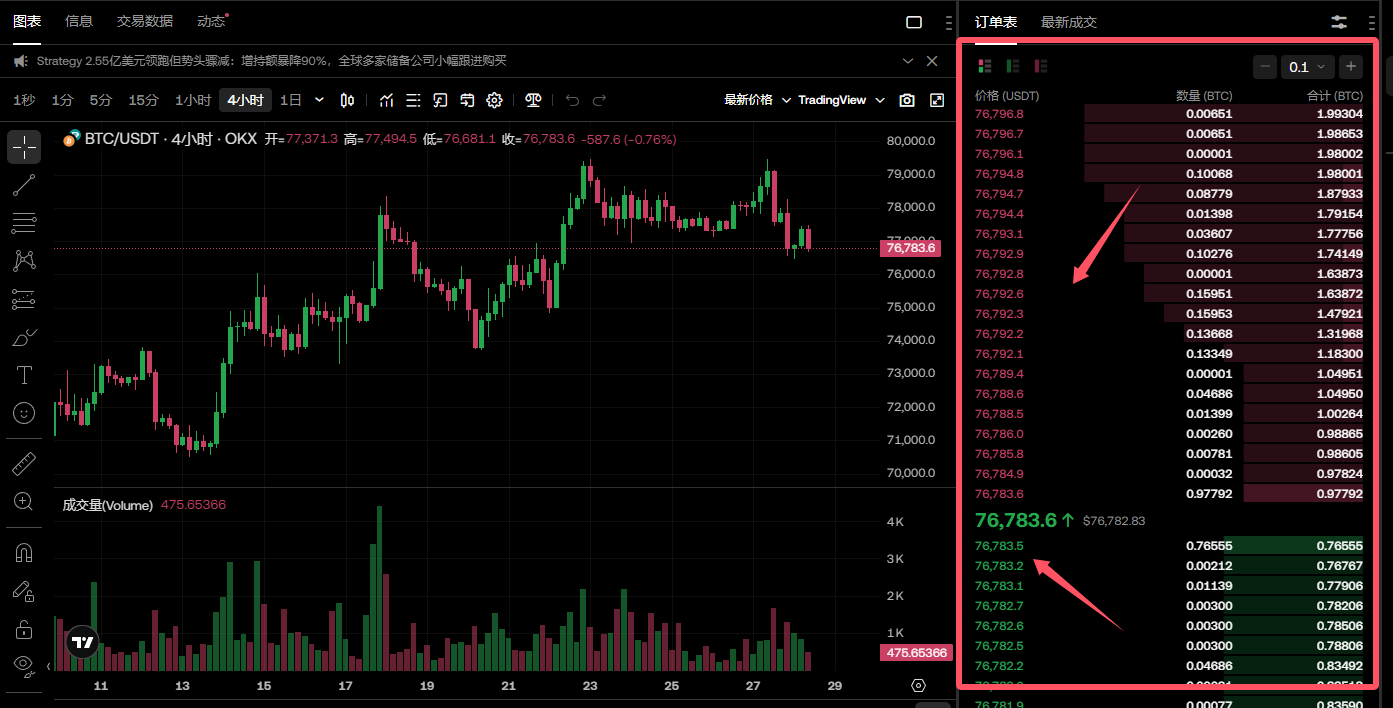 看交易所的订单簿,红色数字代表卖出,绿色代表买入,中间是当前价格。