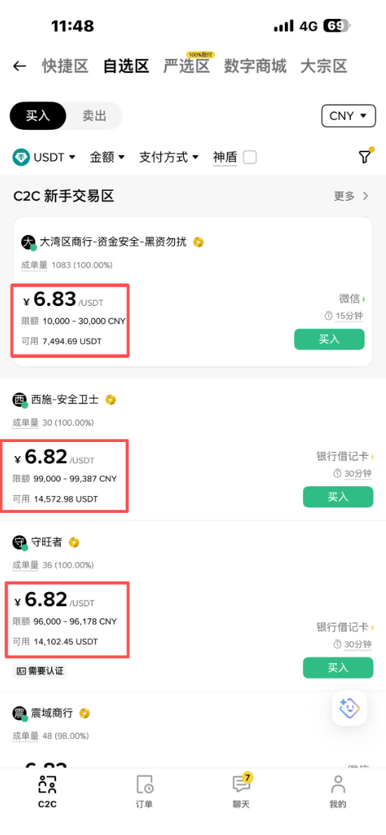 进入C2C页面:把鼠标移到「买币」上,点击「C2C买币」,默认进入快捷区。不想用快捷区就点左上角的「C2C」。选择购买或出售USDT,搜索CNY(人民币),下面就是支持人民币的商家,支付方式有银行卡、支付宝、微信。