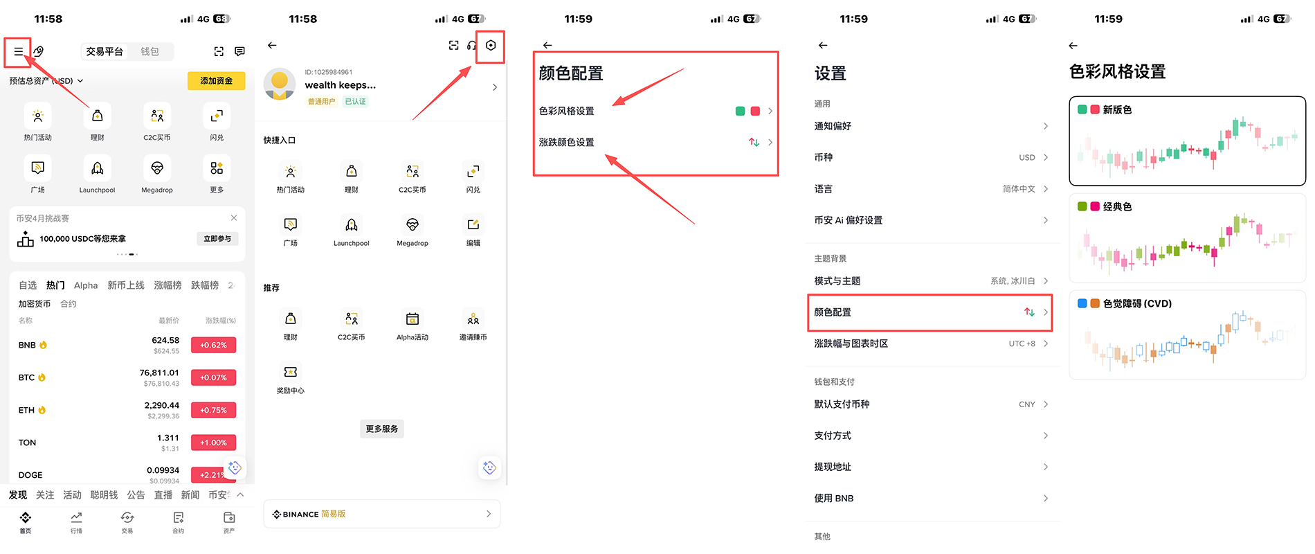 币安设置:左上角设置 → 颜色设置 → 风格设置,也有不同颜色选项,还针对色觉障碍用户设计了特殊颜色。