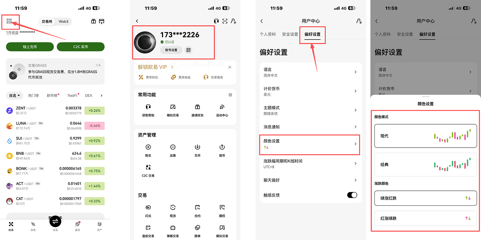 欧易设置:左上角个人资料 → 偏好设置 → 颜色设置,可以选择红涨绿跌或绿涨红跌。