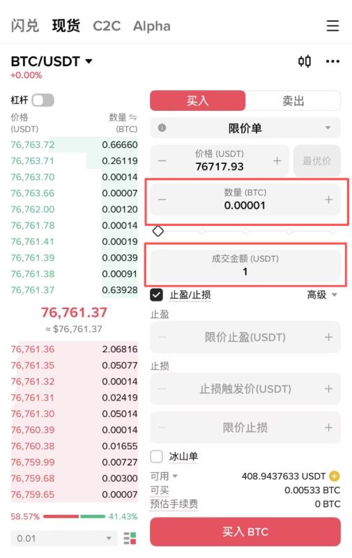 在欧易交易所用闪兑功能,1颗USDT就能直接兑换比特币,不用花手续费。币安也一样,0.2美金(约1.4元人民币)就能购买比特币。