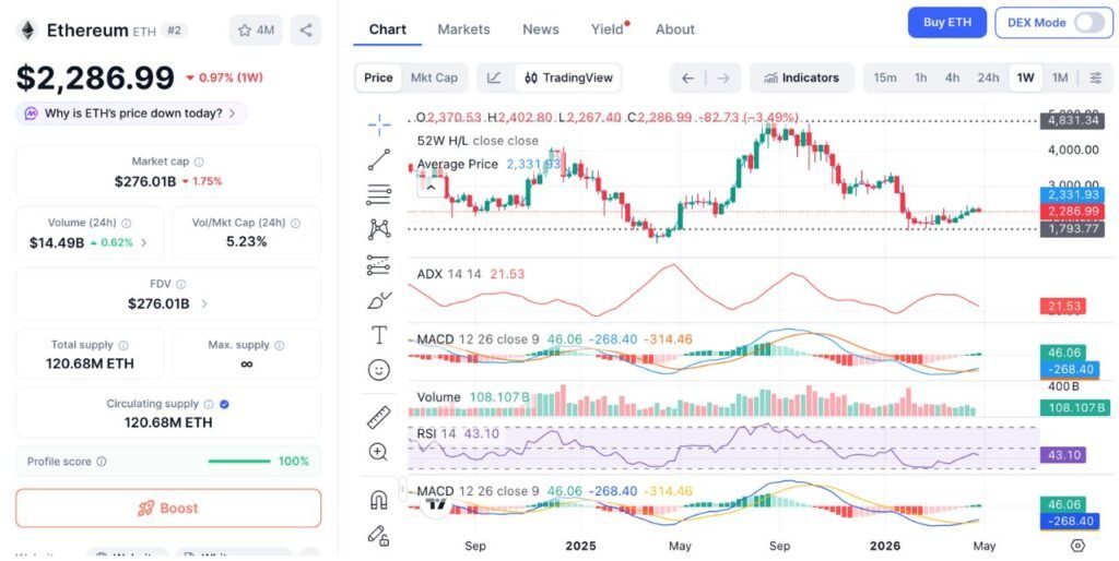 以太坊在脆弱的位置上进入2026年5月,持于$2,300以上,同时挣扎着建立强劲的上行动力,最近的走势显示出复苏的尝试,但阻力仍然使进展缓慢,同时,广泛市场信号呈现出混合的…