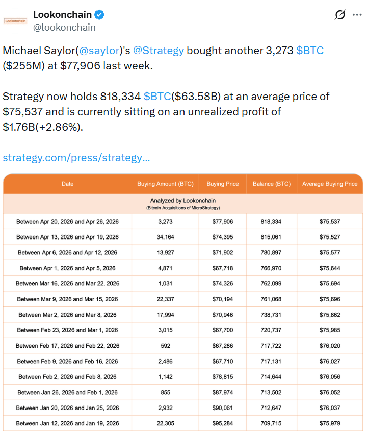 Strategy是目前最大的上市企业比特币持有者。该公司在4月20日至26日期间斥资2.55亿美元购买了3273枚比特币,使其比特币总持有量达到818334枚。