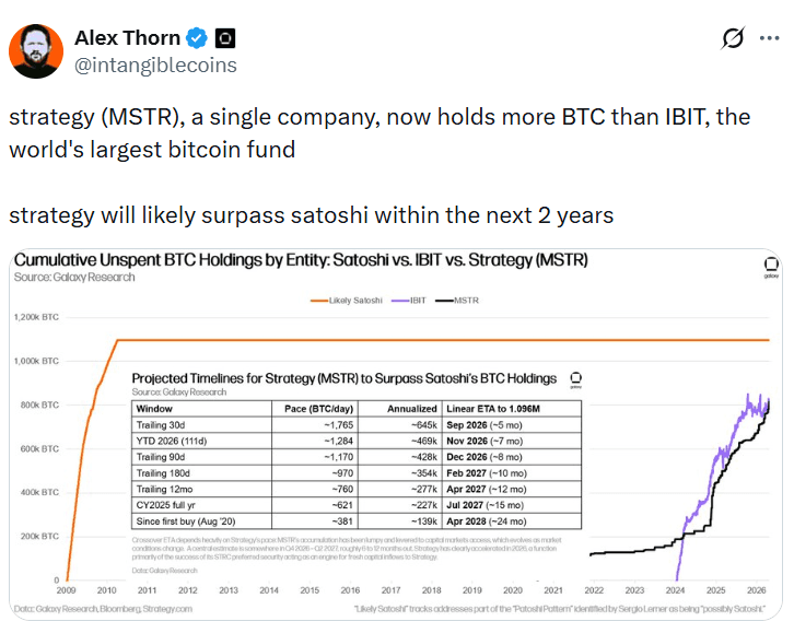 据专注于加密货币的金融服务公司 Galaxy Digital 的研究主管 Alex Thorn 称,如果Strategy 继续以目前的速度发展,其持有的比特币数量可能在未来两年内超过比特币创始人中本聪的持有量。