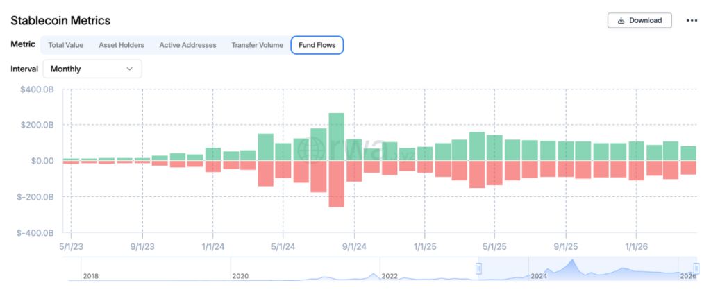 并非所有稳定币的走势都一致。不同发行方之间的净资金流动差异是当前数据集中最具启发性的部分之一。