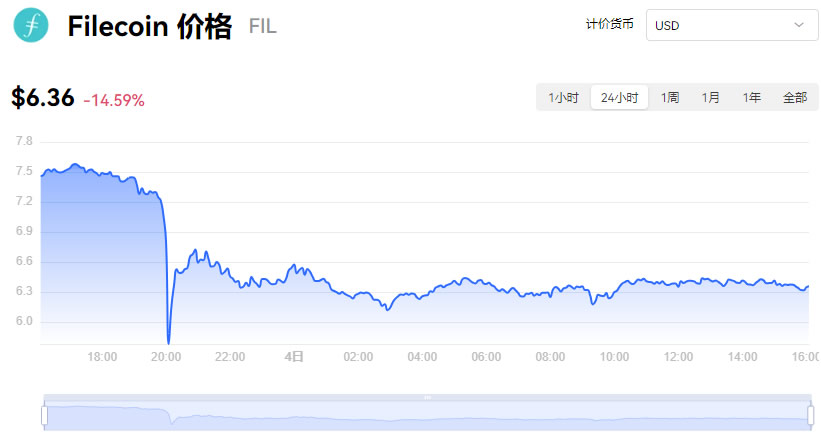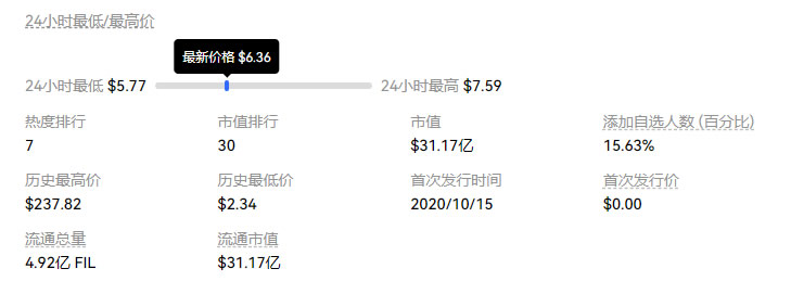 Filecoin 当前价格为 $6.36。Filecoin 的价格在过去 24 小时内下跌了 14.59%。目前,Filecoin 市值排名为第 30 名,实时市值为 $31.17亿,流通供应量为 4.92亿 FIL,最大供应量为 19.61亿 FIL。我们会实时更新 Filecoin/USD 的价格。