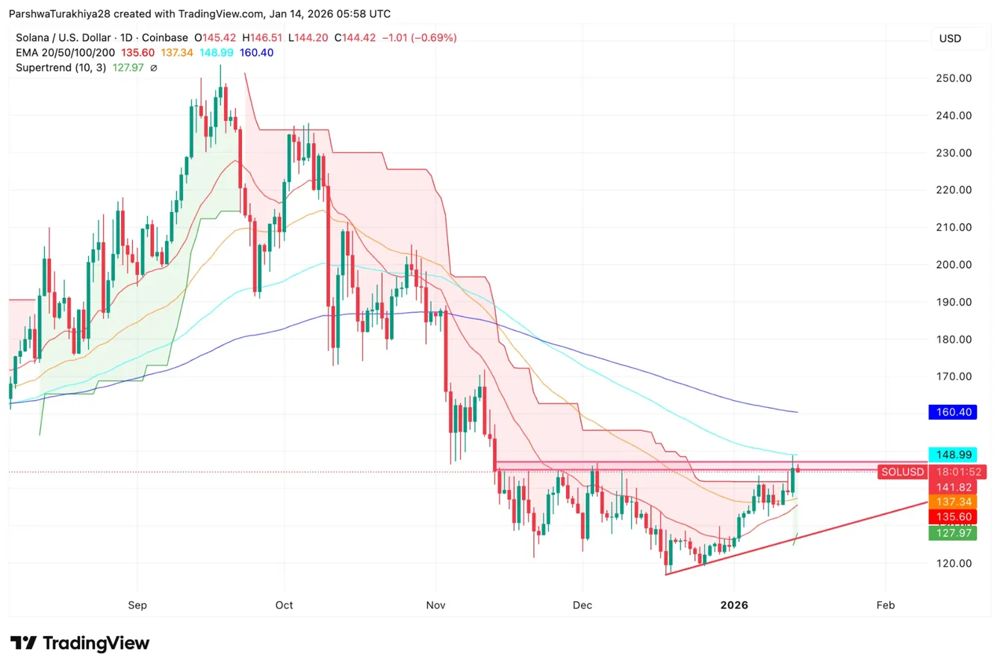 如果趋势线保持有效,则该形态有利于延续。如果SOL守住144美元并放大成交量后重新站上148美元,则结构将转为看涨。这将首先指向148.99美元的100日均线,如果动能增强且高杠杆多头仓位被证明正确,则有望进一步上探至160美元和200日均线。