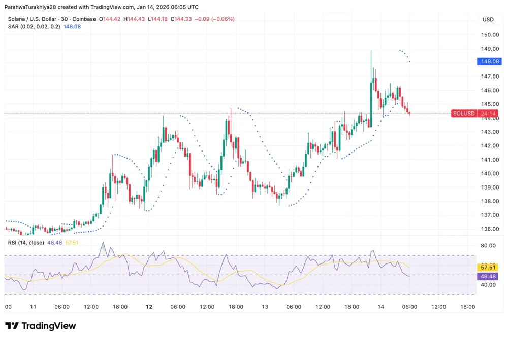 30分钟图表显示,Solana股价在148-149美元附近受阻后回落,抛物线转向指标(Parabolic SAR)在148.08美元附近构成上方阻力。相对强弱指数(RSI)为48.48,在近期上涨行情中从超买状态回落后,目前处于中性状态。