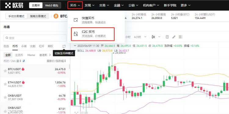 9、然后再点击上方导航栏的【买币】——【C2C买币】