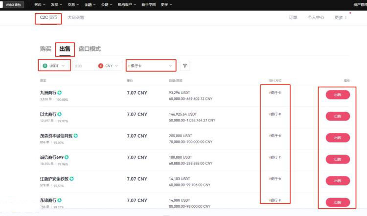 10、选择【C2C买币】——【出售】就可以看到众多出售USDT商家,根据情况选择合适的商家,点击【出售USDT】,填入卖出数量,点击【出售USDT】即可变成人民币。