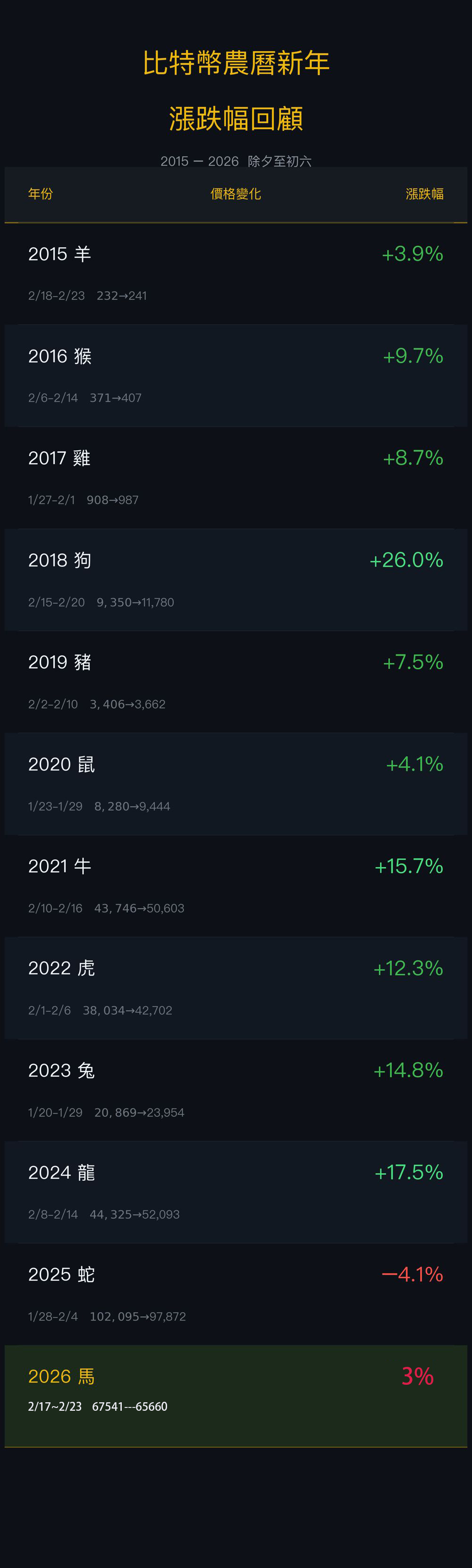 从2015 到2024 年,比特币在春节假期期间连续十年收红,平均涨幅约12%。其中表现最猛的是2018 狗年(+26%)和2024 龙年(+17.5%),即使在2019 和2020 的熊市中也未跌破。这种季节性效应强到连研究机构Matrixport 都将其称为「比特币春节效应」。