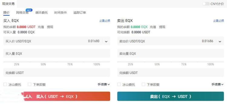 第三步:点击交易EQX/USDT交易对,进入购买页面