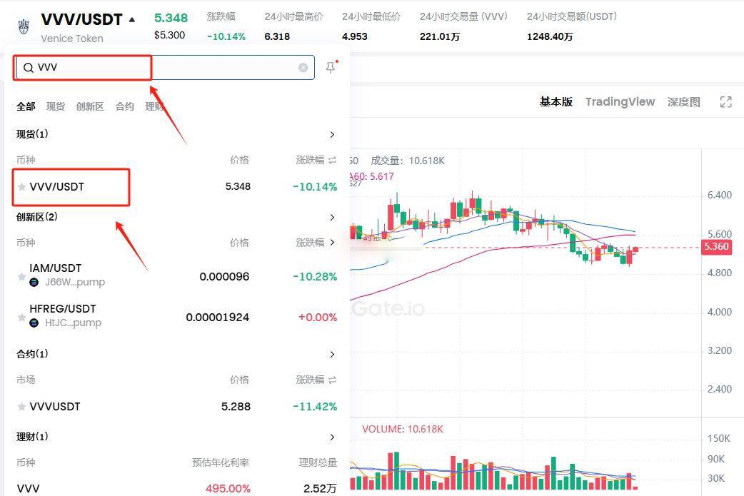 6、在进入也页面后,搜索VVV,选择VVV/USDT,就可以看到该币种的交易信息以及市场信息