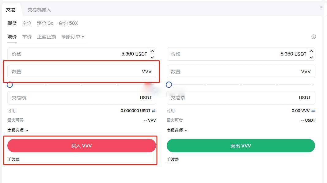 7、输入买入VVV币的数量,点击买入VVV币,就完成购买操作