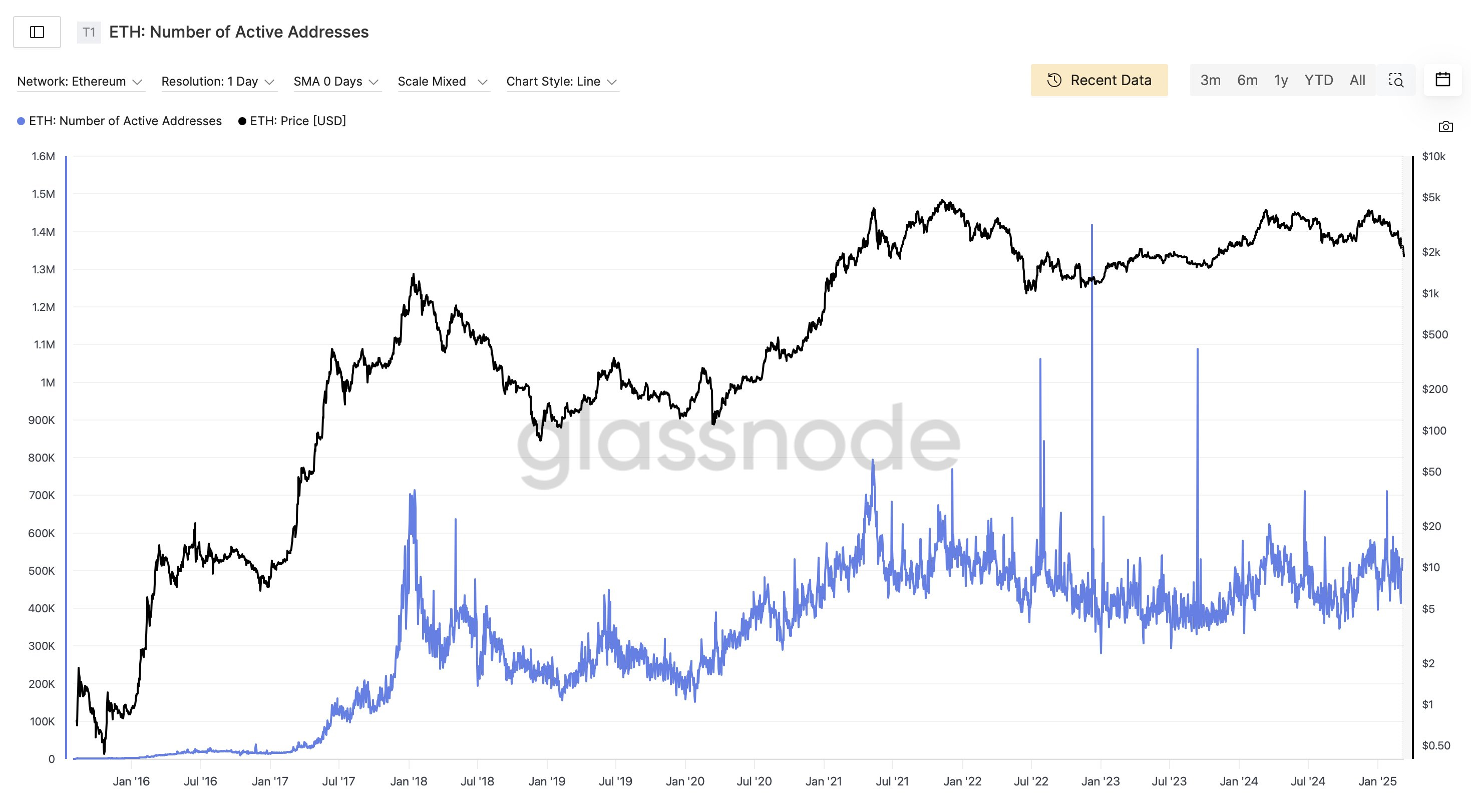 以太坊的基本面近年来似乎正经历一场静悄悄的变迁,而这可能正是大户对ETH前景转而悲观的重要原因。Glassnode数据显示,过去四年,以太坊的活跃地址数量几乎停滞不前,始终徘徊在同一水平线,未能随着市场热潮显著增长。这并非技术优化的“效率区间”,而更像是增长动能的枯竭,显示出以太坊在吸引新用户和开发者方面的疲态。