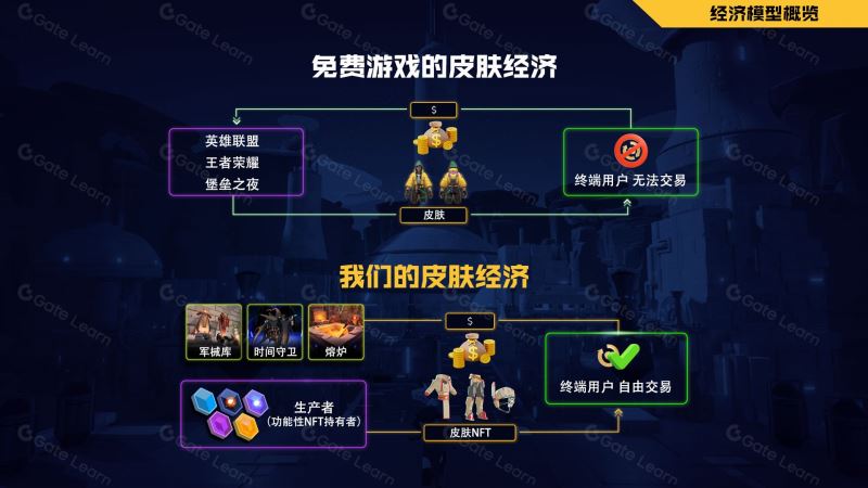 Big Time是“以游戏皮肤为基础的经济”模式。在典型的免费皮肤经济中,例如英雄联盟、堡垒之夜或勇敢者,游戏工作室会直接向玩家出售皮肤。 相反,在 Big Time中,玩家可以通过获取空间和功能性NFT(例如熔炉、军械库、时间守卫)来参与皮肤经济。空间是Big Time的虚拟土地,而功能性NFT是能够实现皮肤制作的场所。
