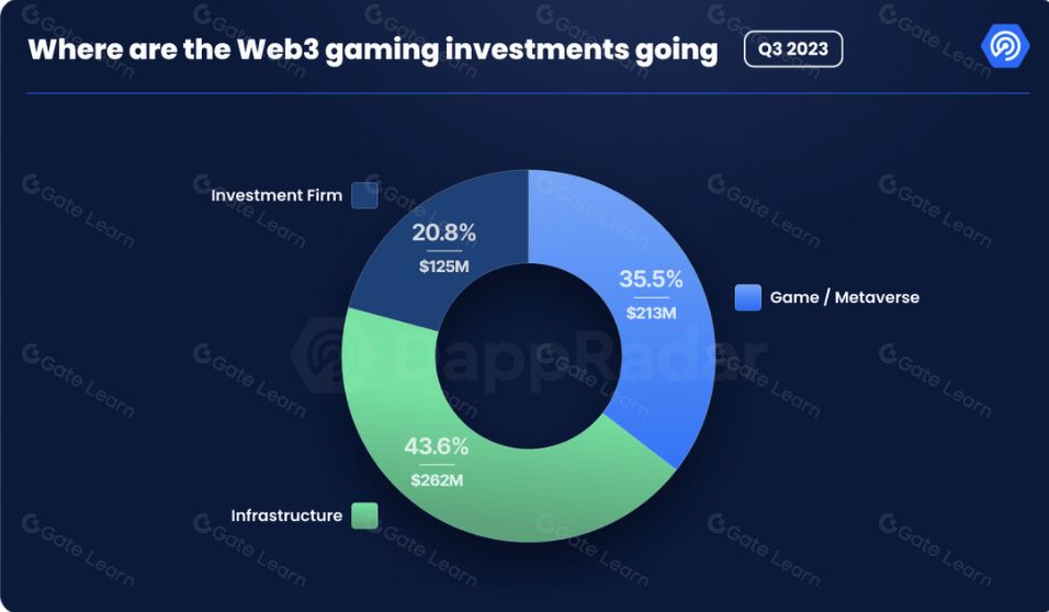 根据 DappRader 第三季度链游报告显示,2023 年第三季度的链游活动平均每日有 786,766 个独立活跃钱包,较上一季度增长12%。2023 年第三季度,Web3 游戏项目获得 6 亿美元资金,使 2023 年总投资达到 23 亿美元。虽然这仅占去年收入资金的 30%,但不能忽略加密领域当前所处的市场阶段。
