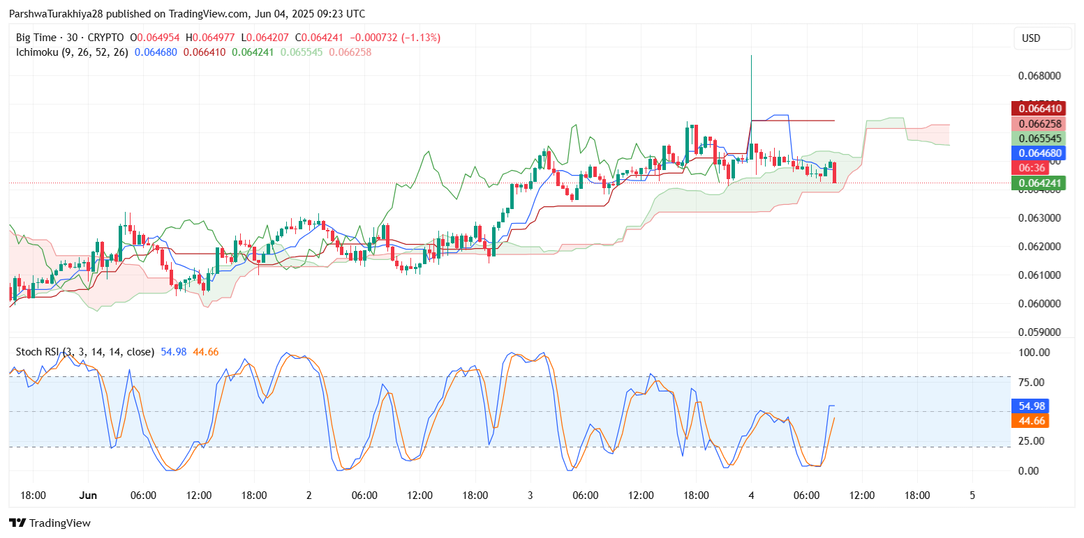 MACD柱状图已转平,MACD和信号线均在零线附近徘徊。这种组合暗示市场犹豫不决,并强化了盘整的叙事。日线图上,一目均衡表分析显示,Big Time在云层内交易,Tenkan-Sen线和Kijun-Sen线显示出有限的方向动量。只有当价格果断突破0.0672美元或跌破0.0610美元并得到成交量确认后,才有可能出现明确的趋势。