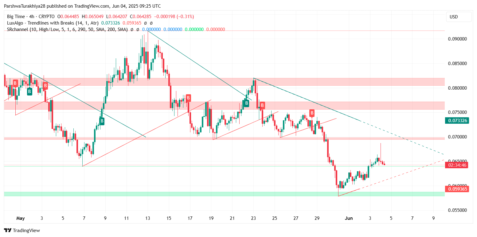 2025 年 6 月BIGTIME价格预测:在低波动性下,多头能否捍卫 0.061 美元的支撑位?