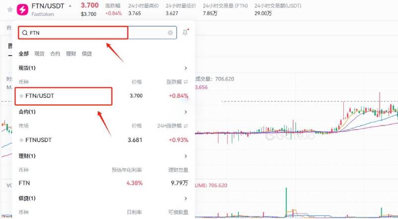 6、在进入也页面后,搜索FTN,选择FTN/USDT,就可以看到该币种的交易信息以及市场信息
