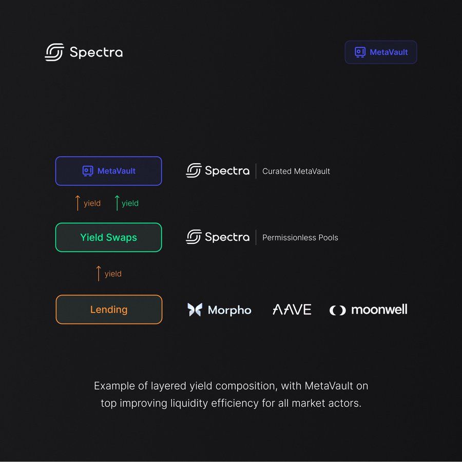 Spectra 正在开发的创新收益聚合工具 MetaVaults,旨在通过优化资本效率和简化用户交互,为用户提供更多高效的收益策略。MetaVaults 将自动化流动性滚动并最大化收益,进一步巩固 Spectra 作为 IRD 技术和生态系统开发的先行者地位。这一功能将解决当前流动性模型中的关键挑战,如流动性碎片化和手动资金再分配的问题。