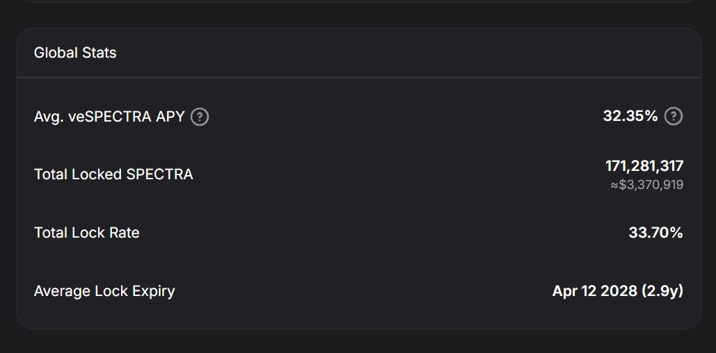 - 截止至 2025 年 4 月 12 日,SPECTRA 的质押总量为 1.71 亿枚,约等于 330 万美元,其总质押率为 33.70%。