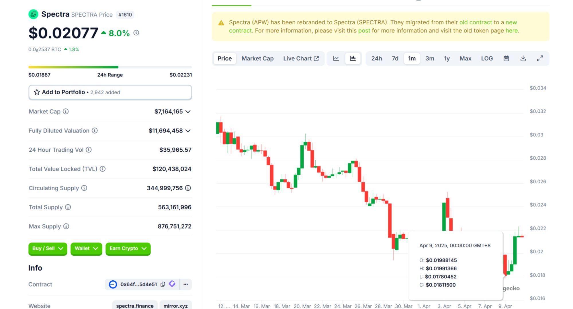 - 市场波动性:SPECTRA 代币的价格可能受到市场竞争、项目发展等多种因素的影响,存在一定的波动风险,当前价格约为 0.021 美元。